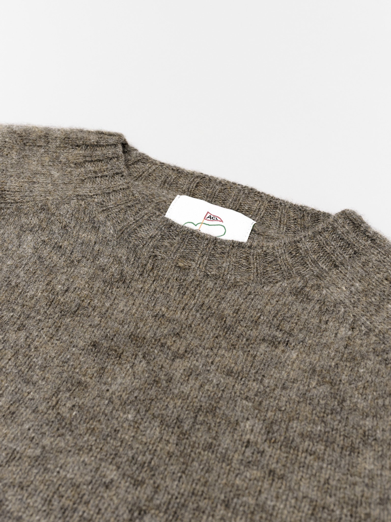 Harley of Scotland x ACL Golf. Crew neck Shetland sweater in Fossil. Made in Scotland from 100% pure wool.